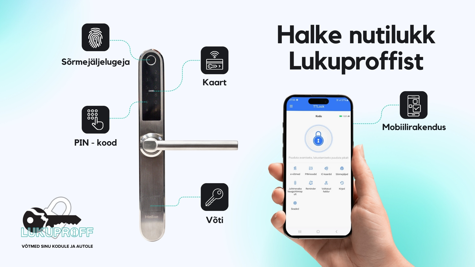 Nutilukk Halke on väga mugav ja lihtne kasutada, pakkudes samal ajal ka kaasaegset turvalisust. See elektrooniline ukse lukustamise ja avamise lahendus sobib erinevate alumiinium-, metall- ja puitustele (30–80 mm paksus) ning eurosüdamikuga lukustusega välisustele. Lukk ühendab endas vastupidavuse ja kaasaegse tehnoloogia, pakkudes mitmekülgseid avamisvõimalusi igapäevase mugavuse tagamiseks.